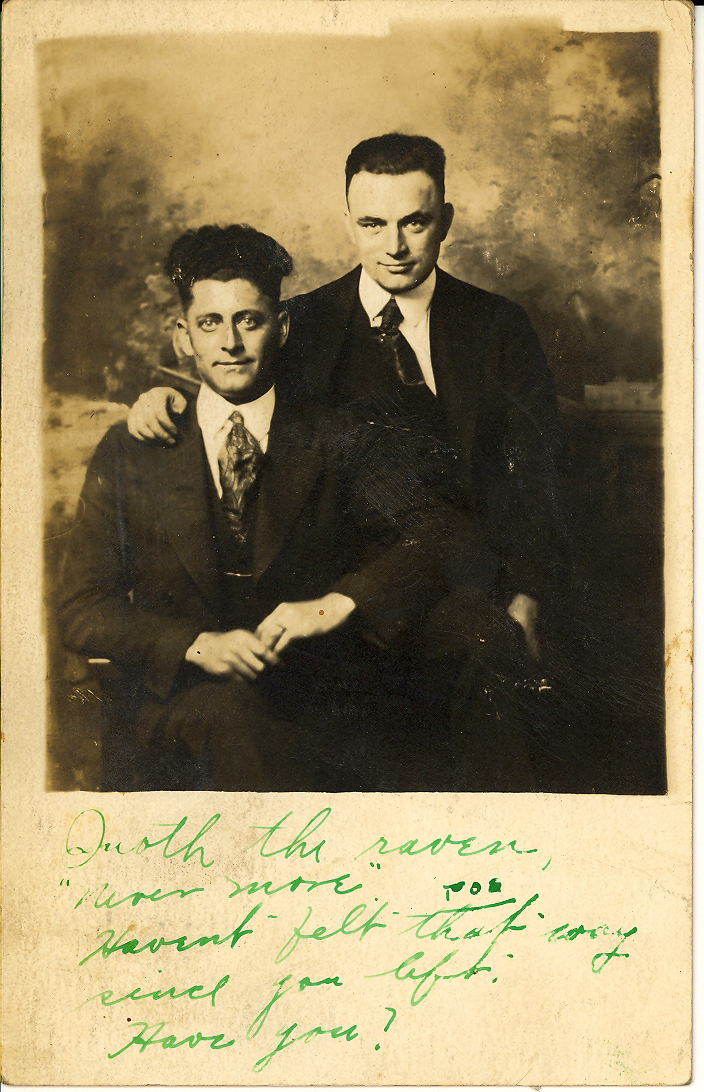 Nothing at all comes up online in a search for L.R. York of Harmony, who received a post card in July 1920 that came to be in the same News-Topic drawer as the photos above. The sender signed his name only as Doug. The return address was in Oakland, Calif. The front of the card shows two men, perhaps 25-30 years old, in nice suits, seated and facing the camera, one seated just behind the other, his hand casually resting on the other’s shoulder. A style of the time was to put personal photos on post cards, so who knows, perhaps the men are L.R. and Doug. Under the photo is written in green ink: “Quoth the raven, ‘never more.’ Haven’t felt that way since you left. Have you?”
